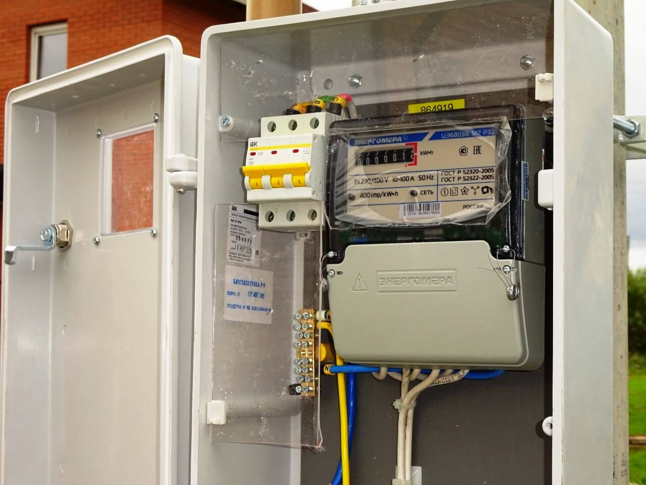 После получения разрешения на подключение к трем фазам и технического условия, приступим к самостоятельной сборке щита. Ввод будет монтироваться в герметичном боксе, который нужно собрать на наружной стене частного дома или столбе. В нем установлен трехфазный счетчик и автоматический выключатель, как показано на фото ниже: