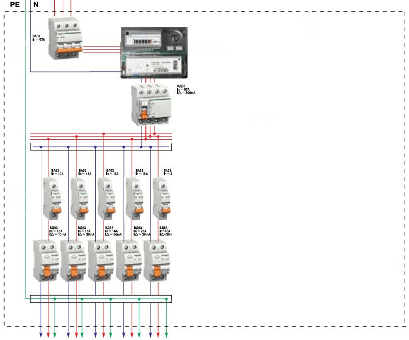 Все провода фаз и рабочего нуля от электрического счетчика к розетке проходят через автоматический выключатель. В отдельных случаях нейтраль допускается пускать минуя его силовой контакт.