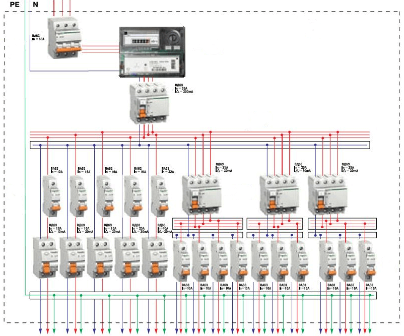Для подключения трехфазного домашнего оборудования собрать щит нужно будет по следующей схеме: