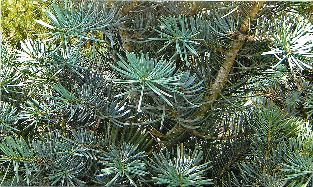 The leaves are needle-like, flattened, 2.5–6 cm (1–23⁄8 in) long and 2 mm (3⁄32 in) wide by 0.5–1 mm (1⁄64–3⁄64 in) thick, green to glaucous blue-green above, and with two glaucous blue-white bands of stomatal bloom below, and slightly notched to bluntly pointed at the tip. The leaf arrangement is spiral on the shoot, but with each leaf variably twisted at the base so they all lie in either two more-or-less flat ranks on either side of the shoot, or upswept across the top of the shoot but not below the shoot.