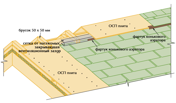 Бруски набить перпендикулярно от конька с шагом 300 мм. Сверху выполнить монтаж ОСП. Таким образом, получится «этажерка». Сверху этажерку накрыть коньковыми плитками мягкой черепицы. Отверстия для выпуска воздуха следует защитить мелкой сеткой от насекомых. Необходимо отметить, что установка самодельного конька далеко не всегда является решением для вентиляции кровли. Зачастую конденсат оседает на тыльной поверхности ОСП в центральной части конька. Затем капли не столько скатываются по уклону наружу, как это бывает в промышленно выполненных аэраторах, сколько дружно капают назад на утеплитель или в пространство чердака.