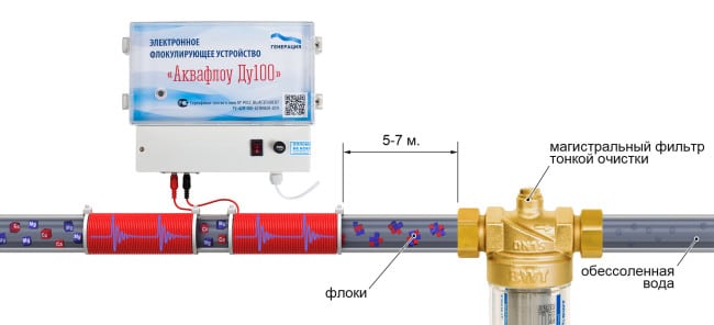 Приборы, созданные в НПИ «Генерация» (г. Уфа) оснащены генераторами импульсов. Они формируют электромагнитные колебания с переменной частотой, которые подаются на две катушки. Их наматывают на верхней поверхности магистрального трубопровода. Такая конструкция позволяет создать достаточно мощное поле, силовые линии которого расположены перпендикулярно направлению потока воды.