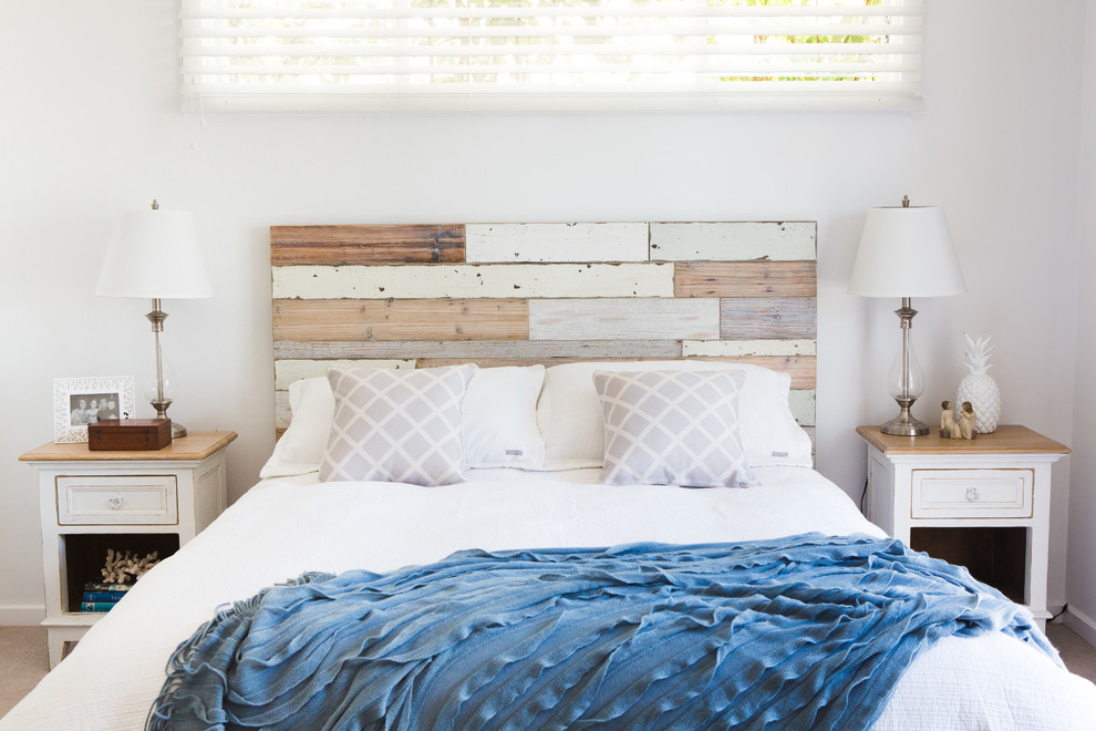 Спальня — старые доски могут стать прекрасной основой для изголовья кровати, туалетного столика, декоративных потолочных балок. В последние можно встроить подсветку, которая эффектно выделит все трещинки на древесине. Подобные элементы в сочетании с деревянным полом придадут спальне очарование уединенного домика в горах с его умиротворением, гармонией.
