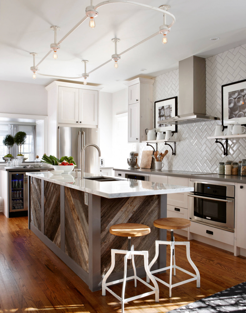 Гармоничное сочетание старой доски и металла в интерьере кухни