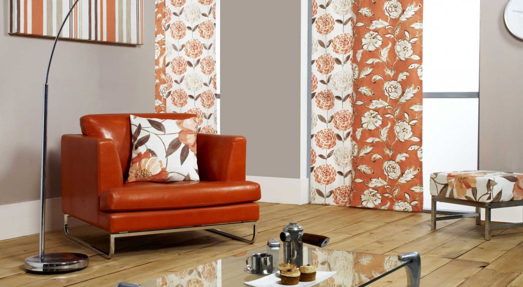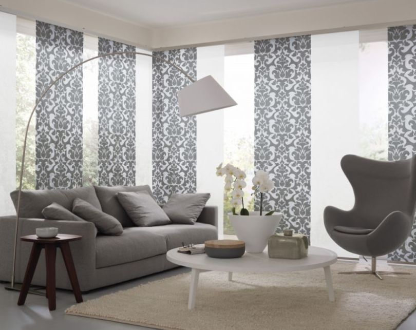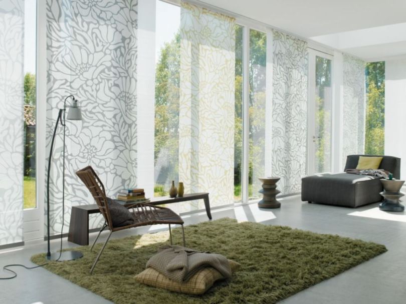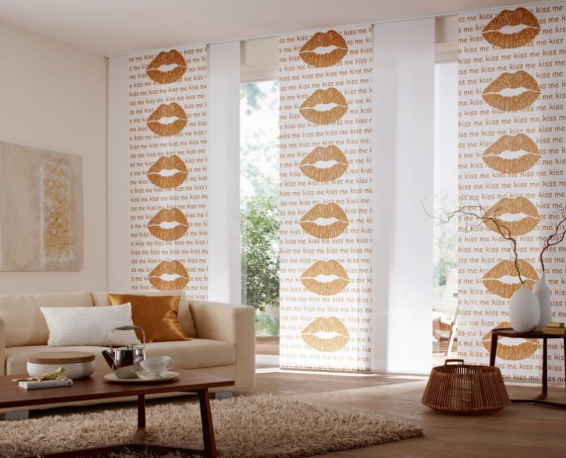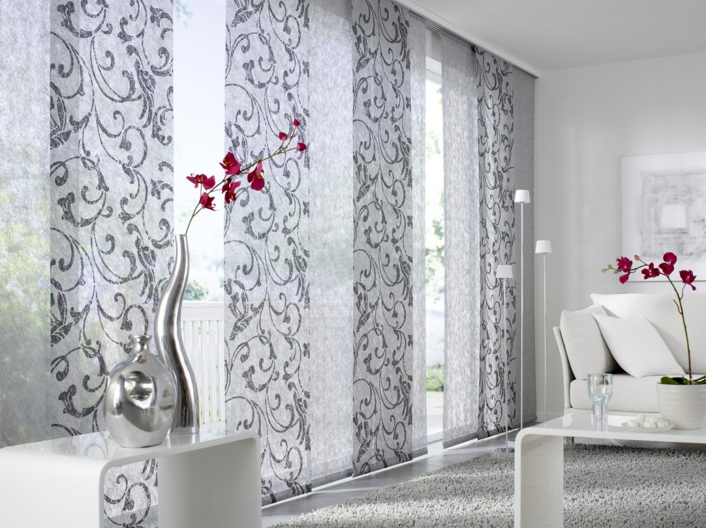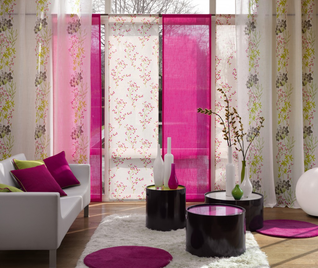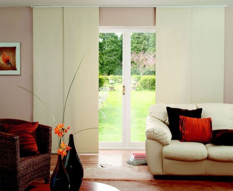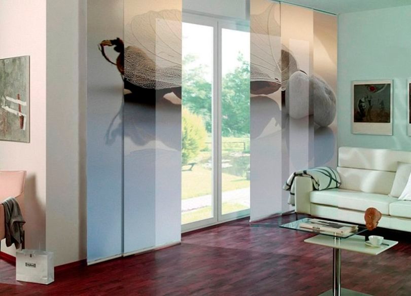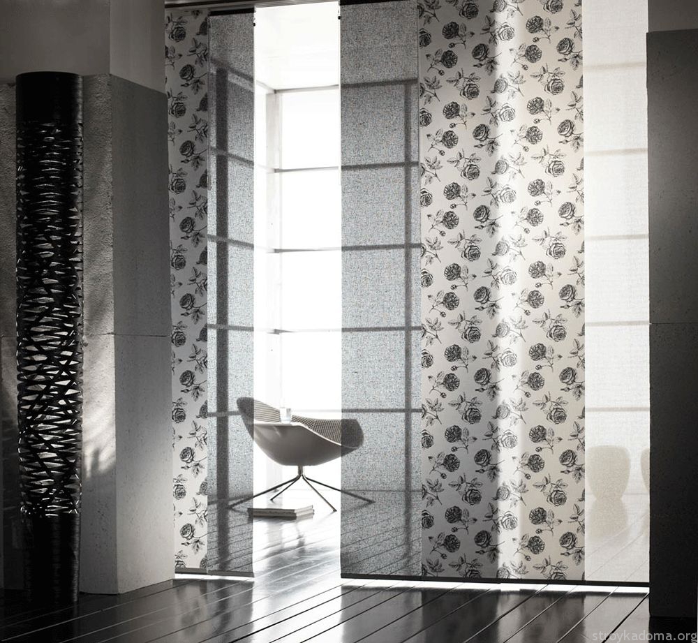 Японские панели отлично подойдут для зала. Можно поэкспериментировать с цветом и фактурой ткани. Элегантно будут смотреться панели из вуали или других полупрозрачных тканей. Для гостиной подойдут занавески ярких цветов и необычных фактур.