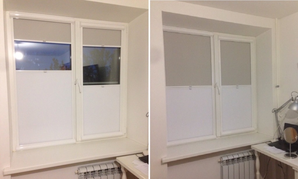 - Приобретаются две кассетные системы жалюзи с общей парой направляющих, и одна монтируется на раме сверху, а другая снизу (на фото под текстом).