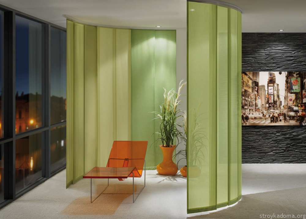 Это универсальный вариант для зонирования – они не занимают места в небольшом пространстве комнат. Можно купить готовые японские шторы, пошить своими руками (при элементарных навыках) или заказать в ателье. Подойдёт любая ткань шириной в пределах 0,75м – 1,5м.