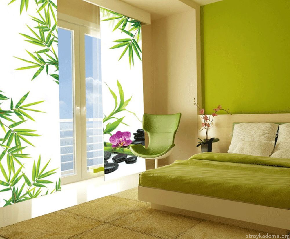 Вариант штор в спальню в японском стиле в ярких летних тонах. Идеально для отеля на берегу моря.