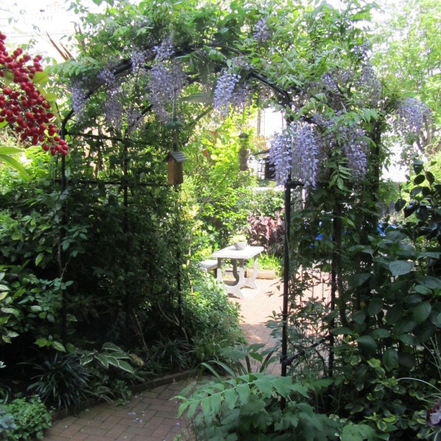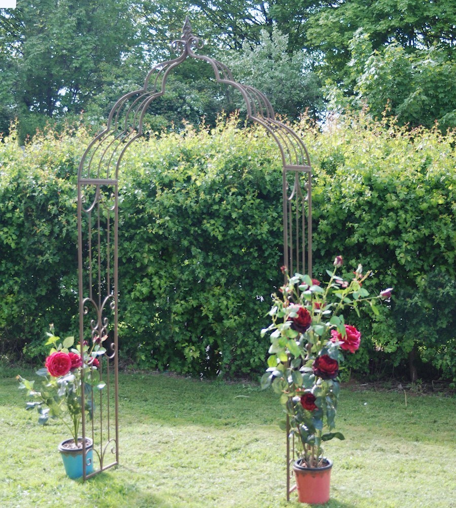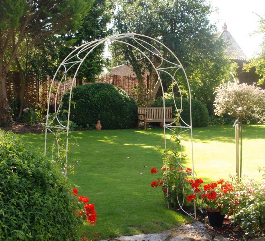 Удивительная сама по себе конструкция, арка используется и для растений в саду. Её украшают диким виноградом, плетистыми розами, вьюнком. Другие растения, подходящие к этой конструкции — клематисы и жимолость.