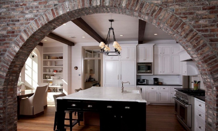 Проход из коридора в гостиную или из библиотеки в кабинет может выглядеть намного оригинальнее, чем обычная дверная створка, навешенная на металлические петли, регулярно требующие смазки от скрипа. В частности, проем можно оставить полностью открытым, что обеспечит удобство, ввиду отсутствия преград, и придаст эстетическую завершенность любому дизайну. Сторонники монументальности для сооружения арки обычно выбирают кирпич, поскольку с его помощью можно отделать проем с намеком на средневековье, с замковым камнем и прочими сопутствующими штрихами.
