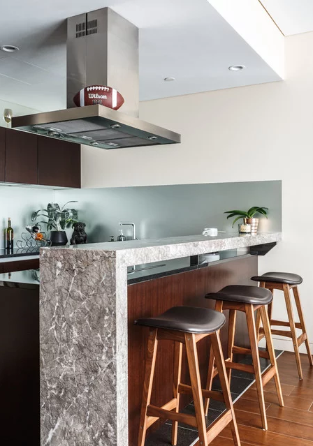 Кухонная зона расположена напротив окна, внешне лаконичная, но укомплектованная застройщиком всей необходимой встроенной техникой. От гостиной она отделена стильной барной стойкой из натурального камня, за которой может расположиться до 3 человек. Все пространство продумано и очень удобно зонировано.