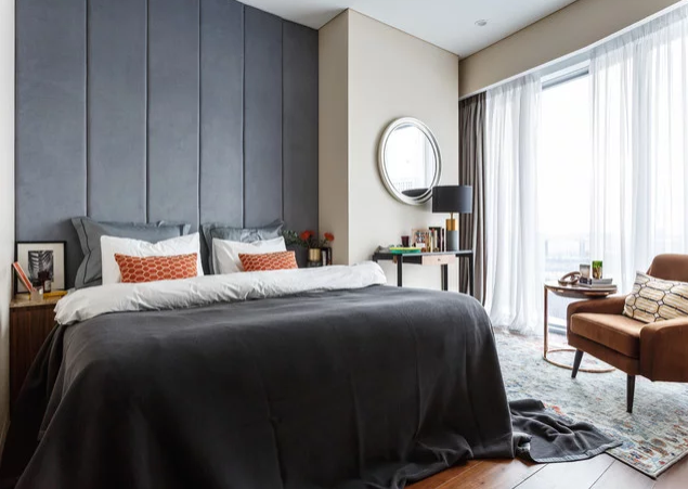 Основной цвет оформления – серый, обыгранный в разных оттенках и фактуре материалов, усиливает атмосферу отеля. В спальне реализована интересная идея дизайнера – изголовье от кровати до потолка, выполненное из обитых мягкой тканью панелей. Здесь тоже присутствует мебель на высоких ножках, металлические элементы. Но мраморные столешницы теплого цвета, терракотовое кресло и овальное зеркало добавляют этой комнате больше уюта. Санузел с ванной и душевым отсеком, выполненный из прекрасного мрамора остался без изменений.