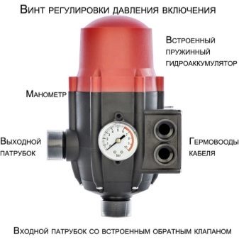 - Реле. Контролирует запуск и остановку насоса. Необходимо для контроля оптимального давления в системе. При продаже имеет базовые настройки от производителя, которые могут изменяться согласно нуждам конкретной системы.