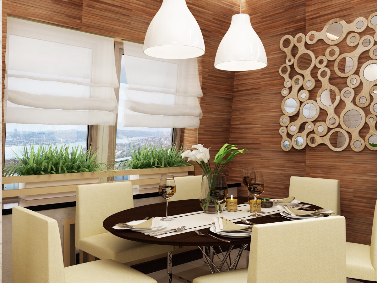 Выполняя отделку квартиры в стиле модерн, часть деревянной отделки можно заменить на однотонные бамбуковые обои. Этот прием не только удешевит проект, но и придаст интерьеру неповторимую оригинальность.