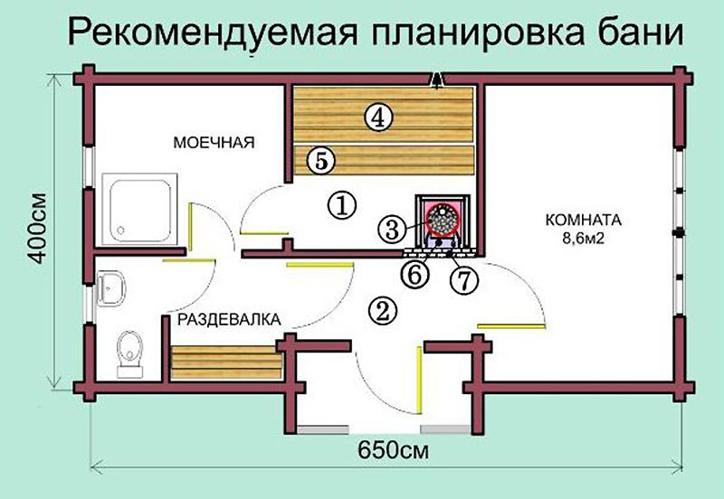 На рисунке представлен самый универсальный вариант планировки бани, размер которой 3 на 6 метров. Все компактно и есть место для комнаты отдыха, площадью 6кв. м, душевой 4кв, тамбура 2кв и парной 6кв.м. Это самое выгодное строение на любом загородном участке, который имеет малую площадь, но так хочется иметь свою собственную баню.