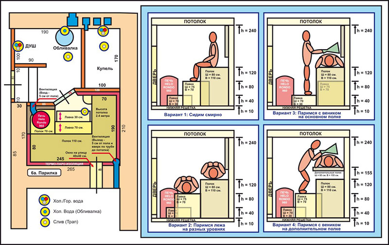 Парное помещение необходимо как можно дальше отодвигать в проекте от входной двери. Располагается парилка в максимальном удалении от входных дверей. Окон в парилке не делают, дверь – только одна. Основные размеры (длина, ширина, высота потолка) могут быть любыми, но внутренние размеры рассчитываются согласно существующим нормативам, куда входят стандарты: