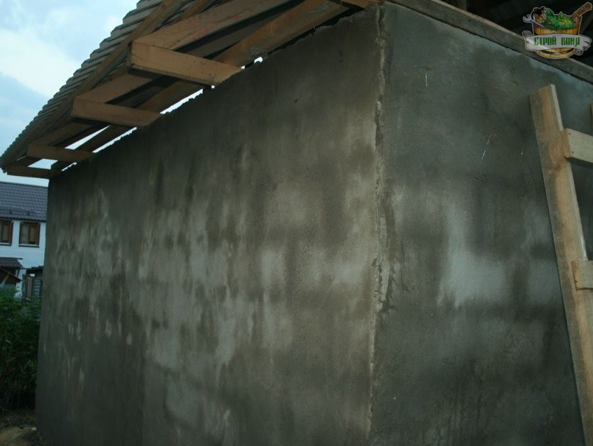 Кладка блоков велась по уже готовому ленточному фундаменту, защищенному двумя слоями гидроизоляции из рубероида. Использовались блоки с размерами 200х300х600 мм. Клал я их на ребро, то есть толщина стен получилась 200 мм.