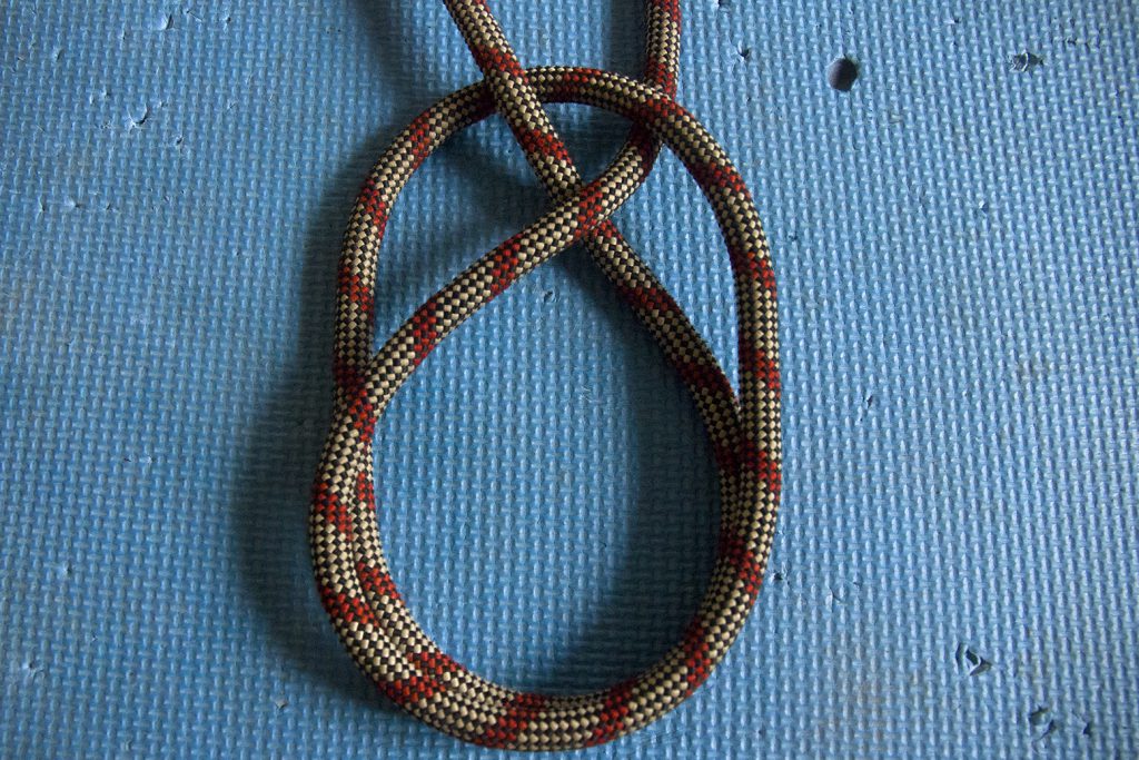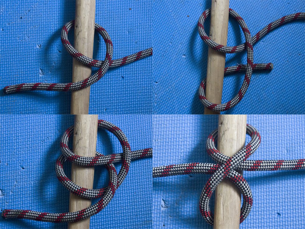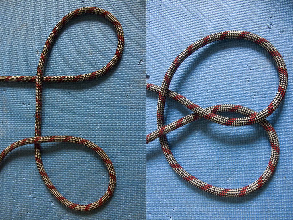 Стремя может быть завязано двумя способами – с использованием петель и одним концом. При создании опоры для ноги, а также креплении на открытом бревне, удобно вязать узел с использованием петель. Для этого нужно взять верёвку двумя руками и одновременно скрутить её, чтоб образовались две петли как на фото снизу и дальше наложить одну на другую.