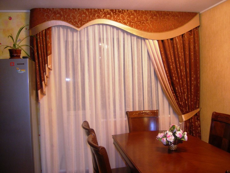 Очень интересно смотрится ламбрекен, выполненный с использованием сразу нескольких видов материала отличающегося друг от друга по цвету и фактуре и дополненный различными декоративными вставками и бахромой. Таким образом, на нем можно создавать различные узоры или рисунки. Использование такого ламбрекена сделает оформление оконного проема еще более интересным, а сама занавеска даже в том случае, если она изготовлена из однотонного не яркого материала будет выглядеть очень красиво.