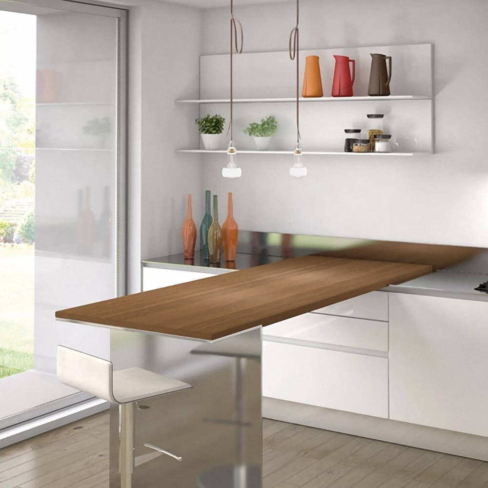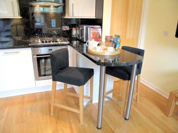 Ну, а теперь самое интересное – как можно обыграть барную стойку, если требуется учесть такой фактор как маленькая кухня при условии, что стойка будет служить именно столом? Конечно, на ум приходит классический вариант, когда стойка имеет красивую опору в виде хромированного металлического шеста от пола до потолка, но в условиях ограниченного пространства от идеи изготовить такую стойку лучше отказаться – ее нельзя будет убрать, а сам шест может мешаться. Лучше всего остановиться на складном варианте. Хотя, впрочем, если грамотно подойти к дизайну и подбору мебели, то можно подобрать и стандартный вариант, который устроит в полной мере собственника кухни.