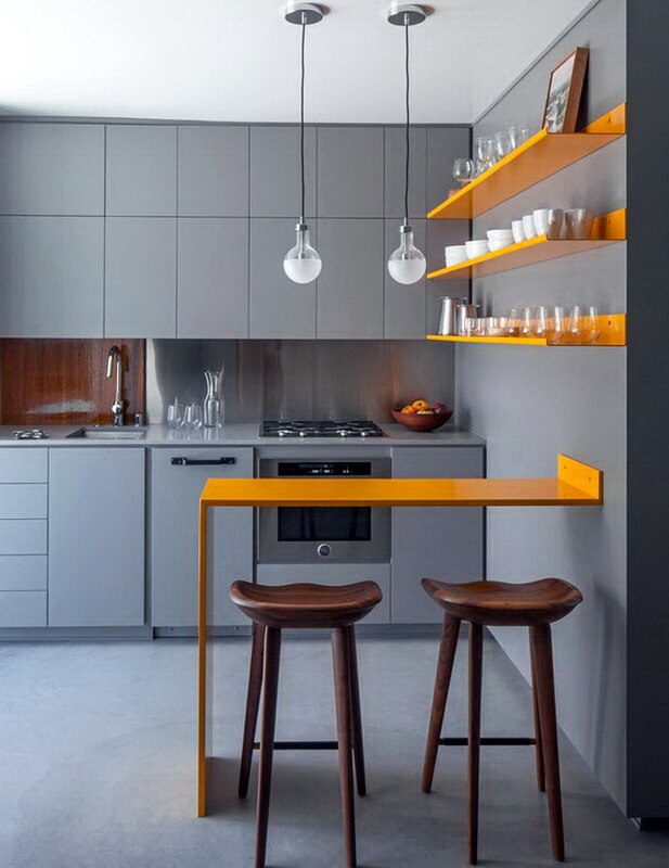 Однако если перегрузить конструкцию полками и аксессуарами, особенно в малогабаритной кухне, помещение зрительно уменьшится, станет тесным и громоздким. Кроме того, барную стойку придется гораздо чаще убирать от пыли и грязи, которая скапливается на приборах, бокалах и рейлингах.