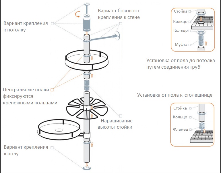 Чтобы установить многоуровневую систему из полок, понадобится барная труба диаметром 5 см. При выборе материала отдавайте предпочтение латуни или никелю – они наиболее прочные и легкие в эксплуатации. Фиксируется штанга при помощи фланцев к потолку и к полу и при помощи бокового крепежа к стене. На трубу для барной стойки одеваются рейлинги, которые позволяют регулировать высоту полок. Такие держатели позволяют менять конфигурацию стойки, добавляя или убирая новые элементы.