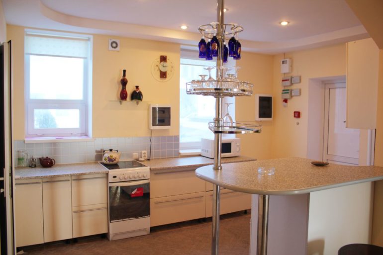 Островок. В этом случае стойка имеет круглую или овальную форму и устанавливается посередине кухни. Имеет небольших размеров столешницу и достаточно неудобная для повседневного использования.