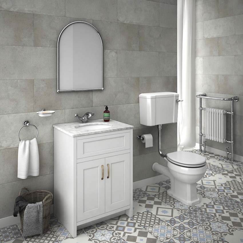 Деревянная рама для зеркала и прочие аксессуары из материала «под дерево» (ручки и ножки на мебели, экран под ванну, держатели для туалетной бумаги, стаканчики для зубных щеток, корзина для грязного белья и т.д.). Деревянные элементы интерьера в совокупности с изящным и роскошным убранством помогут создать дизайн белой ванной комнаты в классическом стиле.