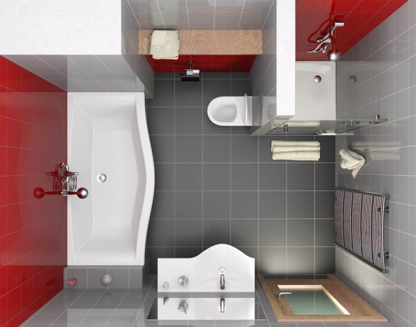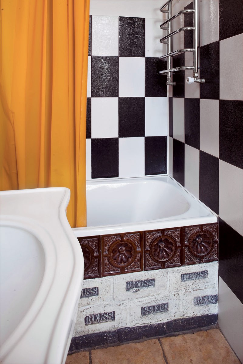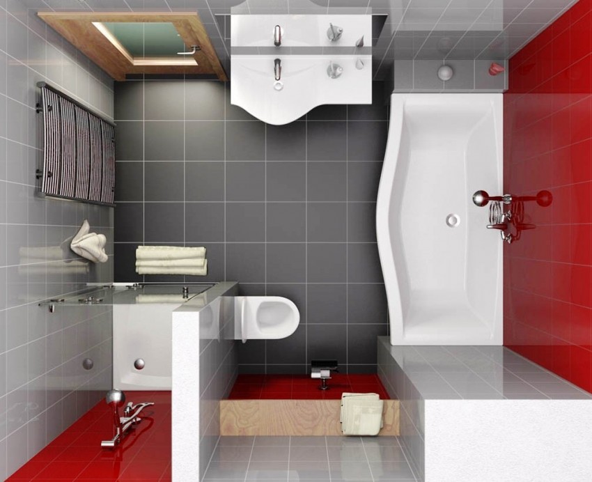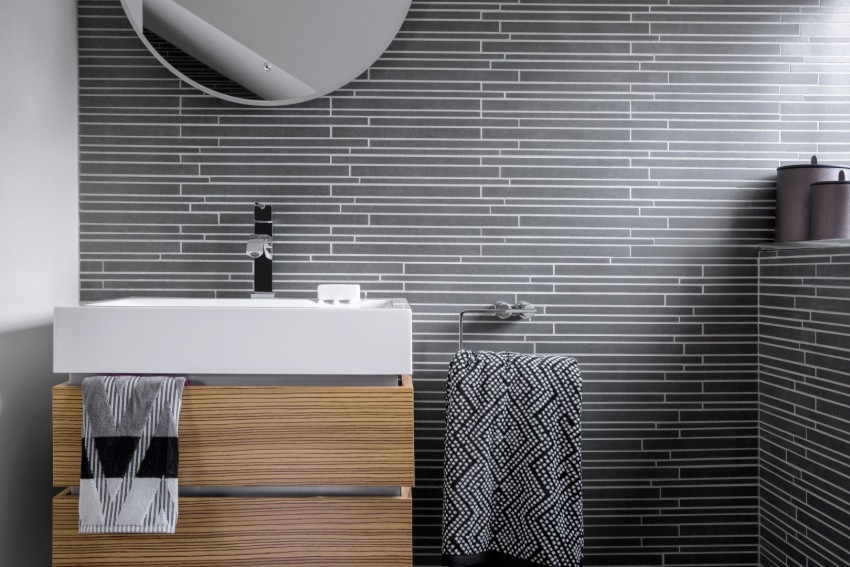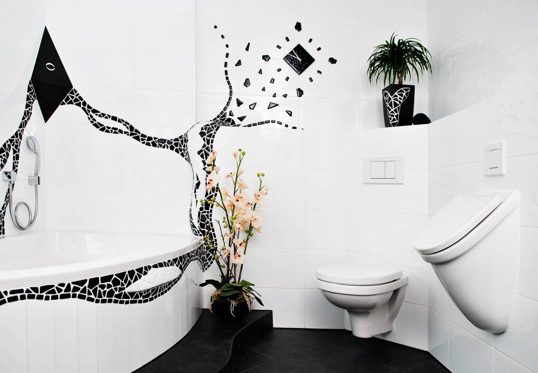 Выделение яркой полосой унитаза, раковины или стиральной машины преображает помещение.