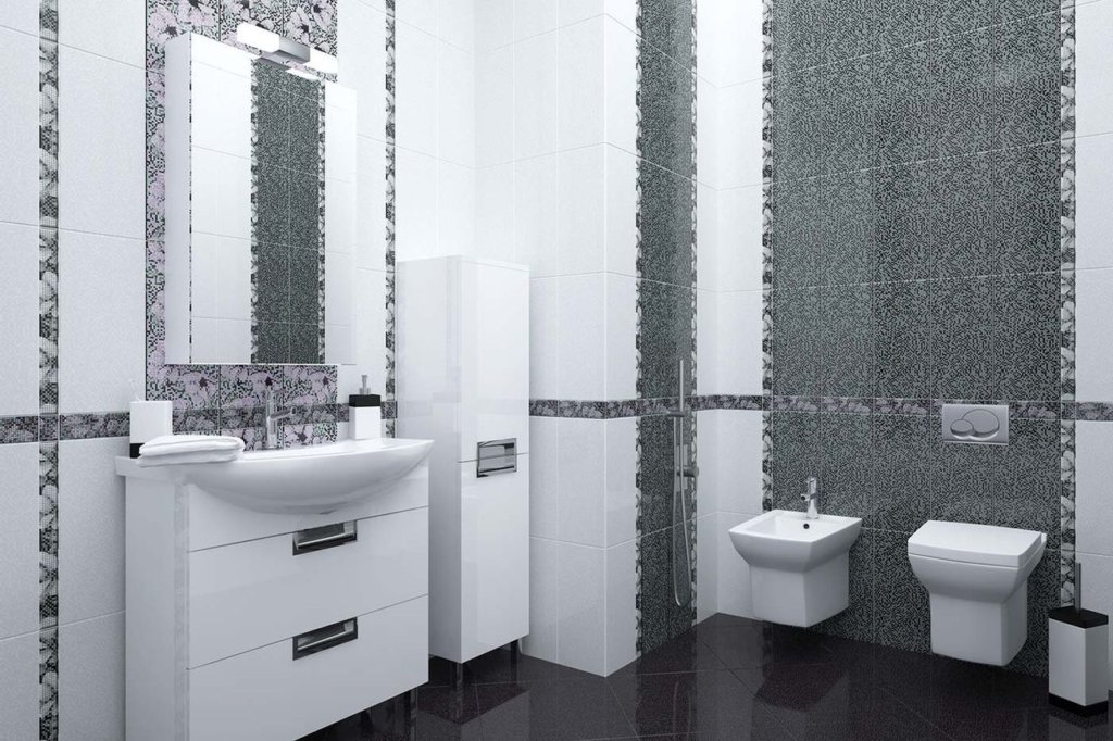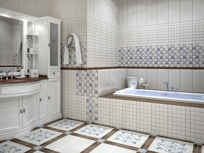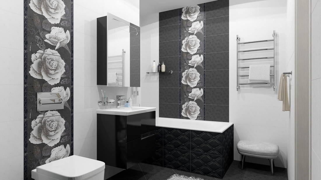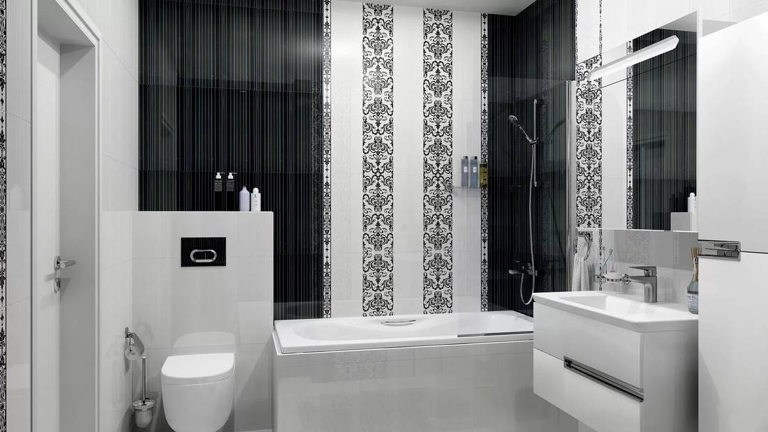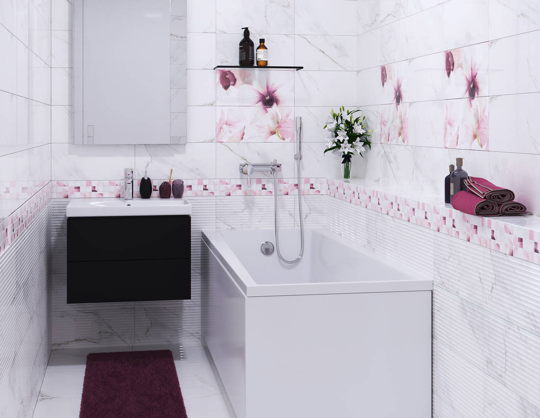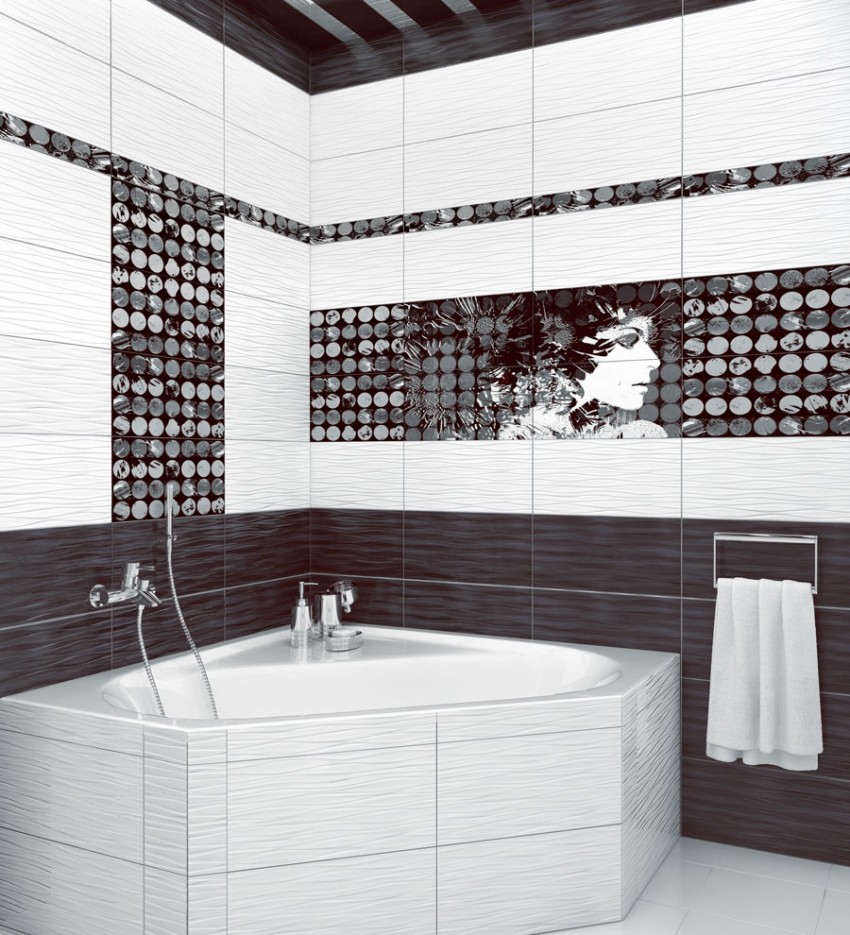 Переходом от темного к светлому служит бордюр (обычно однотонный). Также бордюр используется и под потолком, чтобы придать интерьеру ванной завершенный вид.