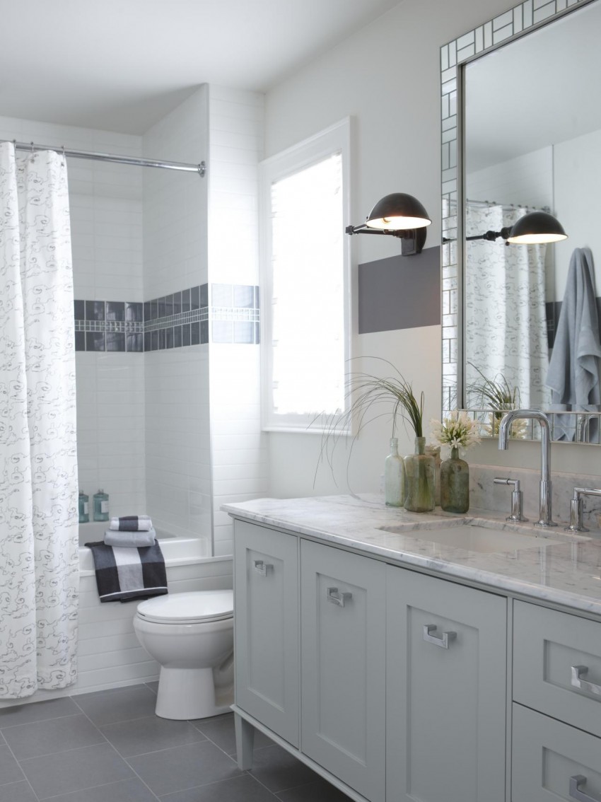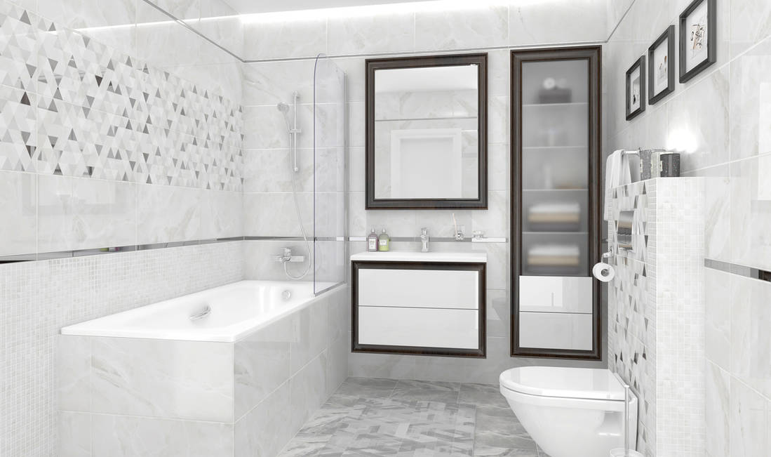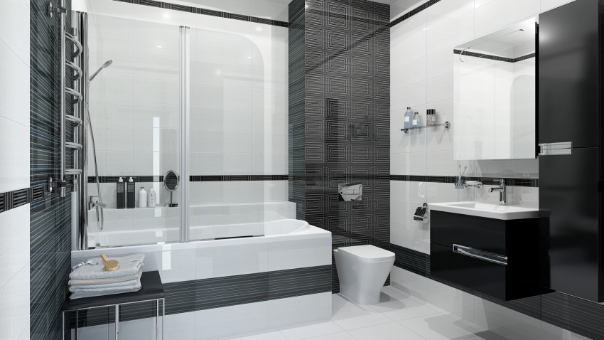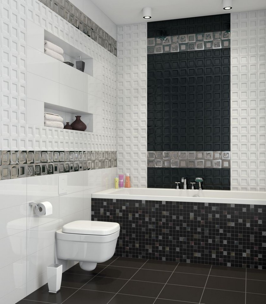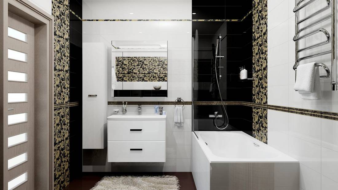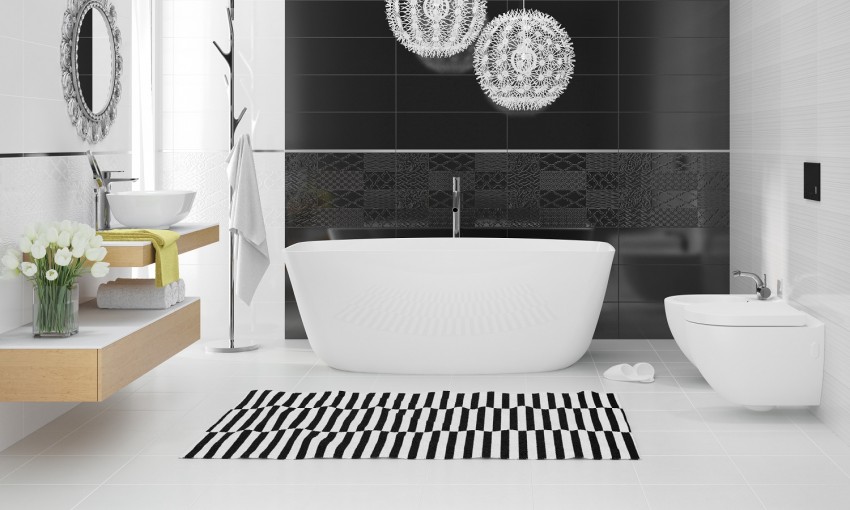 Переходом от темного к светлому служит бордюр (обычно однотонный). Также бордюр используется и под потолком, чтобы придать интерьеру ванной завершенный вид.