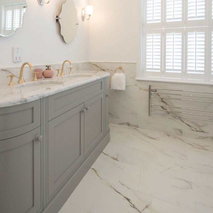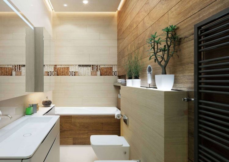 Самый распространенный вариант раскладки плитки в ванной– горизонтальный (темный низ в сочетании со светлым верхом).