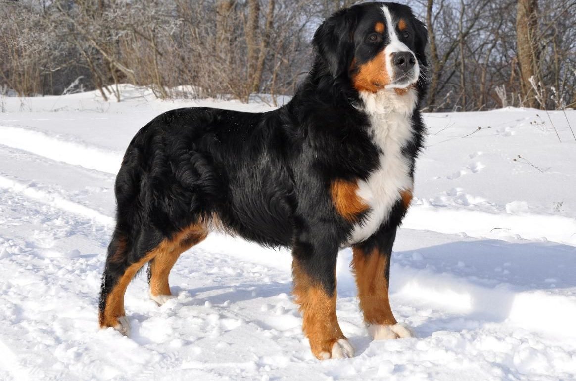 Бернские овчарки – довольно крупные собаки с длинной шерстью черно-палевого окраса и белыми пятнами в районе носа, шеи и лап. Фирменным «знаком» породы считается так называемая «улыбка» бернцев. В спокойном состоянии мышцы морды и головы собаки расслабляются, приоткрывая рот и создавая иллюзию человеческой мимики. Эталонная высота в холке для кобелей – от 64 до 70 см, для сук – от 58 до 67 см. Средний вес бернского зенненхунда колеблется в диапазоне 39-50 кг у особей мужского пола, 38-48 кг – у женского.