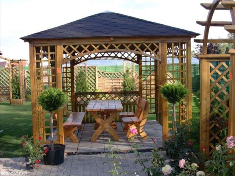 Так как стационарных элементов внутри беседки нет, вы можете время от времени менять стилистические решения, внося свежие нотки в вашу зону отдыха. Можно зашить верхнюю часть беседки диагональной решёткой типа перголы и посадить виноград.