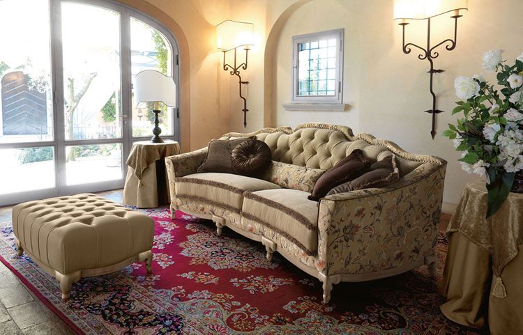- Массивный диван из реального бархата, дорогого велюра, атласа, тисненного гобелена, с выгнутыми ножками и подлокотниками в форме круга будет настоящим украшением в классическом интерьере гостиной. Мебель светлого цвета, изысканные шторы без резких контрастных переходов, постеленный на полу палас с узорами, выразительные аксессуары, хрустальная люстра – удачное решение для бежевой гостиной.