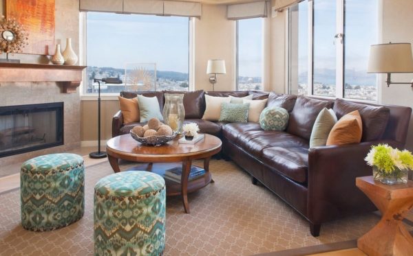 Как вы поняли, коричневый цвет является базовым, значит, коричневый диван – это основа интерьера. Мы может сделать его звучание более эмоциональным, дополнив другими оттенками. Делать это с диванами очень удобно – в нашем распоряжении разнообразные подушки, покрывала, пледы, а также, аксессуары, расположенные в непосредственной близости с диваном. Например, это картины или постеры, которые мы можем повесить над ним, светильники в ярких абажурах и тому подобные вещи.