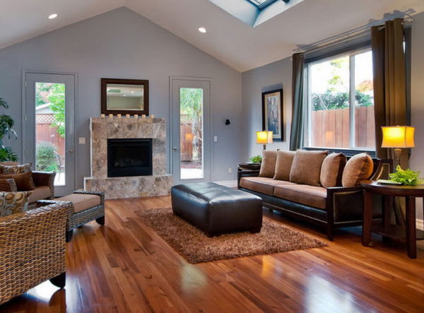 Коричневый цвет в качестве фона очень часто можно встретить в ярко выраженных этнических произведениях искусства, например, африканских народов. Дополнить его оранжевым, красным или жёлтым – всегда будет правильным решением, но не забывайте о такой паре, как анимальный принт. Пледы и подушки под леопарда, тигра, зебру или пантеру легко приживутся в сочетании с коричневым или чёрным диваном в интерьере, как на следующей иллюстрации.