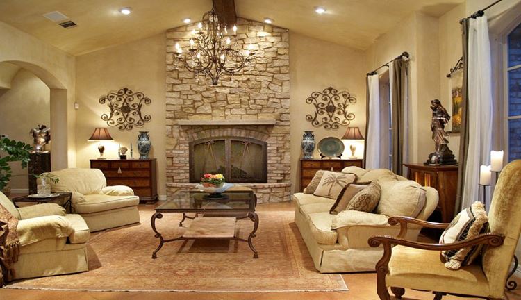 Гостиная в тосканском стиле в теплых жёлто-бежевых тонах