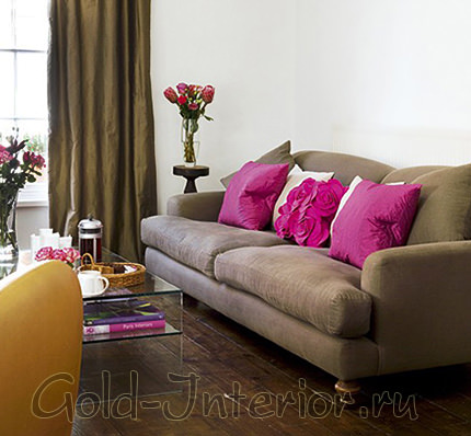 Серьёзный интерьер с коричневым диваном удался, а как сделать наоборот, добавив комнате игривости и романтичности? Путём сочетания коричневого с розовым – но при выборе оттенков нужно быть особенно внимательными. Соблюдайте правило контраста – чем темнее коричневый, тем светлее розовый, верно и обратное. На фотографии ниже – пример для понимания, посмотрите, как сочно выглядят подушки цвета фуксии на фоне светло-кофейной обивки. А дополнительные белые пятна наволочек усиливают этот контраст.