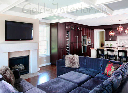 Если синий диван глубокого сапфирового цвета, то коричневый должен быть ему под стать. Например, рядом с таким диваном можно поставить тумбочку или целый гарнитур из вишневого дерева.