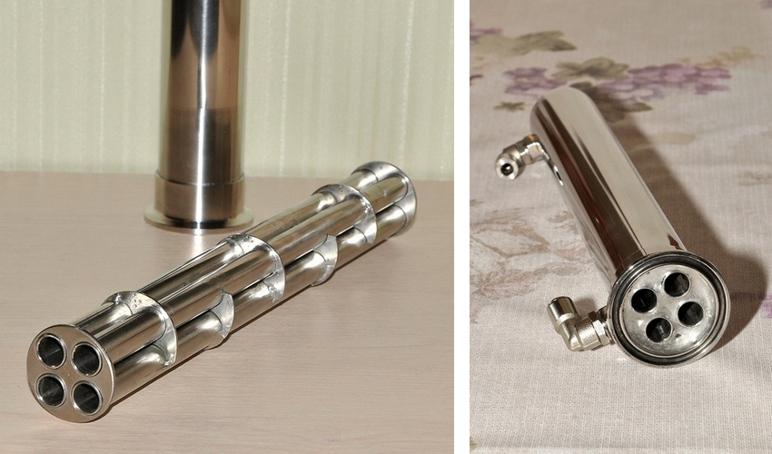 Для колонн в 1,5” предлагаются холодильники длиной 35 см с 5 перегородками и 4 трубками с внешним диаметром 12 мм мощностью до 2,5-3 кВт, и с 7 трубками внешним диаметром 8 мм и мощностью до 3–3,5 кВт. Им соответствуют дефлегматоры длиной 20 см. У дефлегматора с 4 трубками по 12 мм и 3-мя перегородками скорость пара на рабочих мощностях колонны позволяет говорить о стабильности и легкой регулируемости.