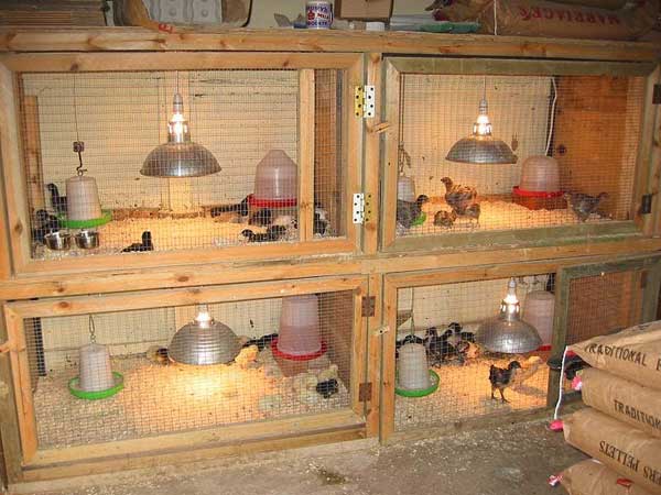 Готовый к поступлению цыплят короб оснащается кормушками, поилками, термометрами для контроля условий содержания, а затем прогревается. Если предстоит выращивать большое количество молодняка, сооружают многоярусные клетки для цыплят.