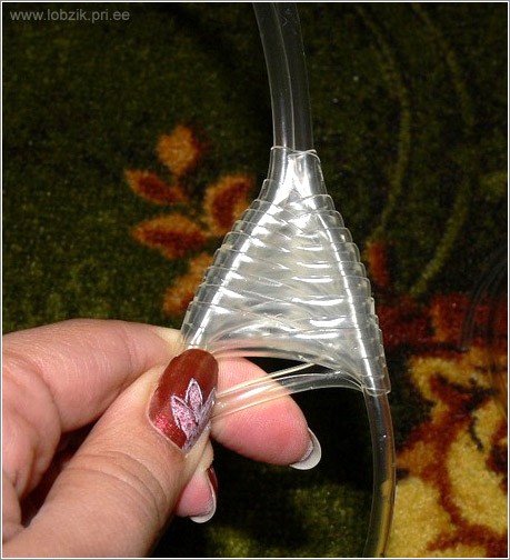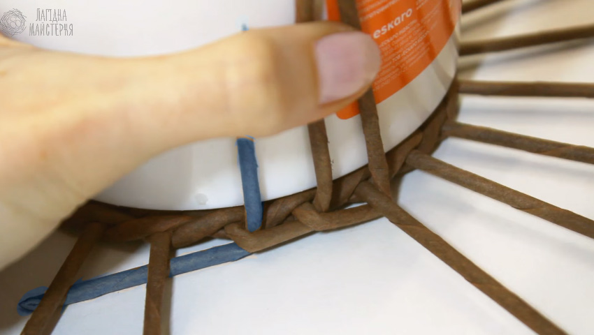Шилом делают отверстия, раздвигают ряды плетения, протаскивают между ними трубочки.