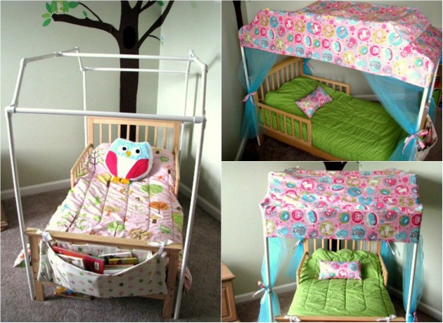 Этот простой навес из труб ПВХ сможет сделать каждый. Получается детская кровать с пологом из тюля.