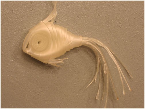 - Оплетаем таким образом несколько раз. Приступим к созданию носа. Скрещиваем две трубки, направляя концы вниз по телу. Концы прикладываем к изделию, захватывая концы около основных трубок. Их нижних жгутиков будет хвост, а из боковушек сделаем плавники.