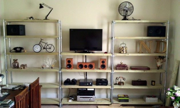 Телевизор, аудиосистема, сувениры и книги — на этом самодельном стеллаже поместится всё. Смотрим здесь, как его сделать.