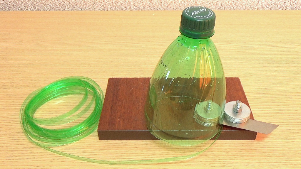 Затем на один из болтов надеть лезвие канцелярского ножа. Положить минимум еще по одной шайбе на каждый болт. Сориентировать лезвие так, чтобы видимая часть его режущей кромки располагалась в зоне, образуемой кратчайшим расстоянием от шайбы до шайбы. Выровнять шайбы и затянуть гайки. Станок готов. Его можно надежно зафиксировать на столе саморезами или струбциной. Полиэтилен, который используется в бутылке бесцветный. Он может быть прозрачным или окрашенным в любой цвет. Самые популярные цвета – зеленый или коричневый. Сначала в кадре будет резаться излишне тонкая лента черного цвета шириной 1,5 миллиметра. Это делается для того, чтобы продемонстрировать, что такая тонкая лента также хорошо нарезается, как широкая.