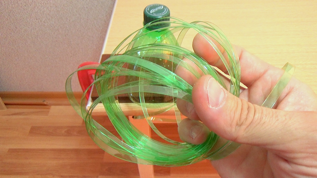 При использовании бутылки объемом на 2 л для нарезки, выходит около 35 метров ленты, толщиной 1,5 мм.