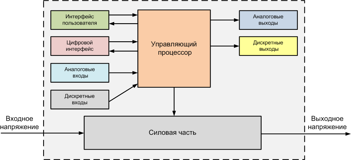 - Силовая часть — выполняет изменение характеристик входного напряжения для достижения требуемой скорости вращения двигателя.