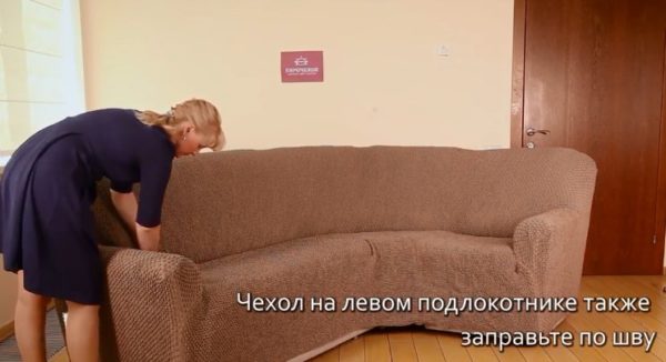 Шаг 3. Чехол надевается на спинку, после чего фиксируется на подлокотнике (начинать работу можно с любой стороны) и расправляется на нем.